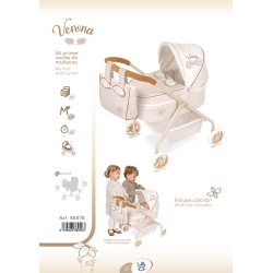 Zestaw zawiera: biało-beżowy wózek dla lalek ze specjalnym nadrukiem Verona, materiałową tacę pod spodem, koła z cichą piankową osłoną, wyściełaną kierownicę, twardą gondolę, wysuwaną maskę, pasującą torbę na wózek i inne luksusowe detale.