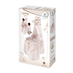 W zestawie: łóżeczko dla lalek i niemowląt z baldachimem i wyściełanym wnętrzem, kocyk, pasująca poduszka i inne luksusowe detale.