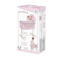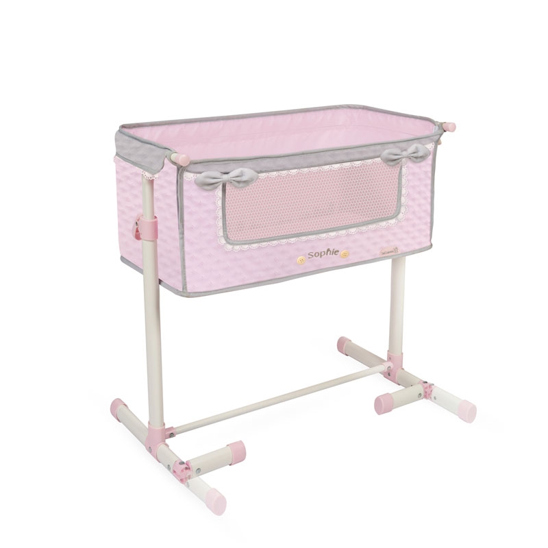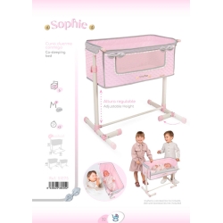 Zawiera: 1 łóżeczko dla lalki Duerme Conmigo z kolekcji Sophie, różowe z szarymi detalami, konstrukcję z regulowaną wysokością, wyściełany materiał, wyściełane kokardki, ozdobne drewniane guziki, haftowane detale i wiele innych luksusowych detali.