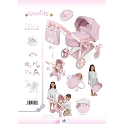 Zawiera: 1 wózek dla lalek 3 w 1 z linii Sophie, różowy z białymi i szarymi detalami, który można przekształcić w wózek lub nosidełko ze składaną konstrukcją, kierownicę z regulowaną wysokością, obrotowe przednie koła, wyściełany materiał, wyściełane kokardki, haftowane detale , ozdobne guziki z naturalnego drewna, kółka z piankową osłoną, pokrywka z małą kieszonką, dopasowana torba z uchwytami z naturalnego drewna, dopasowana taca do przechowywania z tkaniny.