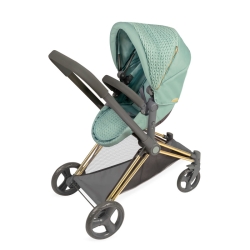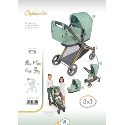 Zawiera: 1 zielono-czarny wózek dla lalek Capriccio o konstrukcji 3 w 1, który można przekształcić w wózek i gondolę, składaną konstrukcję, obrotowe przednie koła, pas bezpieczeństwa przypominający szelki, dolną półkę do przechowywania, wyściełaną i gładką tkaninę, część chromowaną struktura, dopasowana torba i więcej luksusowych detali.